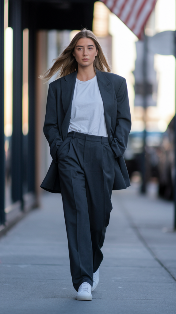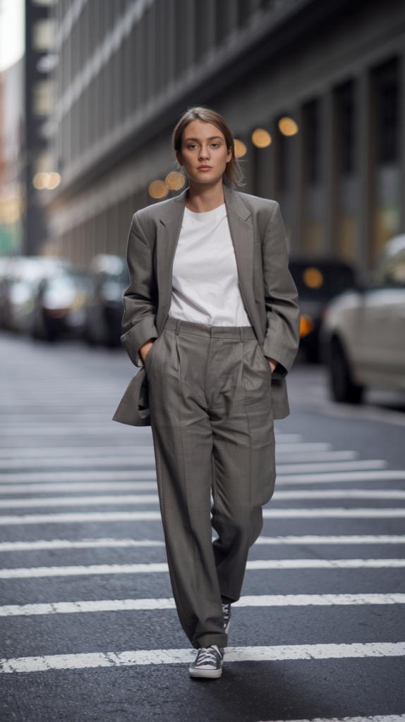 This look succeeds because it communicates modern confidence. The blazer suggests authority, while the sneakers remove intimidation. It’s polished without pressure.