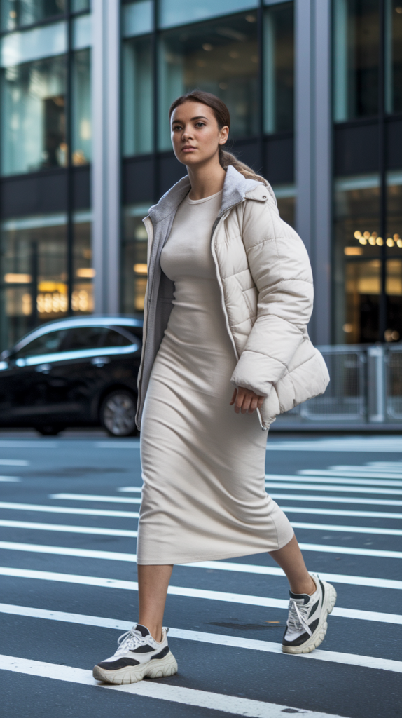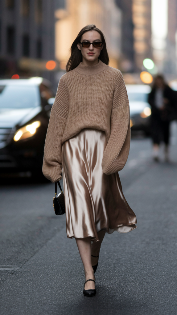 Then the satin skirt enters — fluid, light-catching, quietly elegant. Suddenly, the outfit shifts. Cozy doesn’t disappear — it transforms.