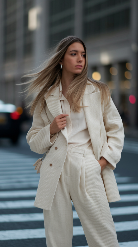 Casual chic outfits like blazers with sneakers, relaxed suits, or tailored trousers with knits are perfect alternatives to traditional office wear. The key is choosing structured pieces and keeping colors neutral and clean.