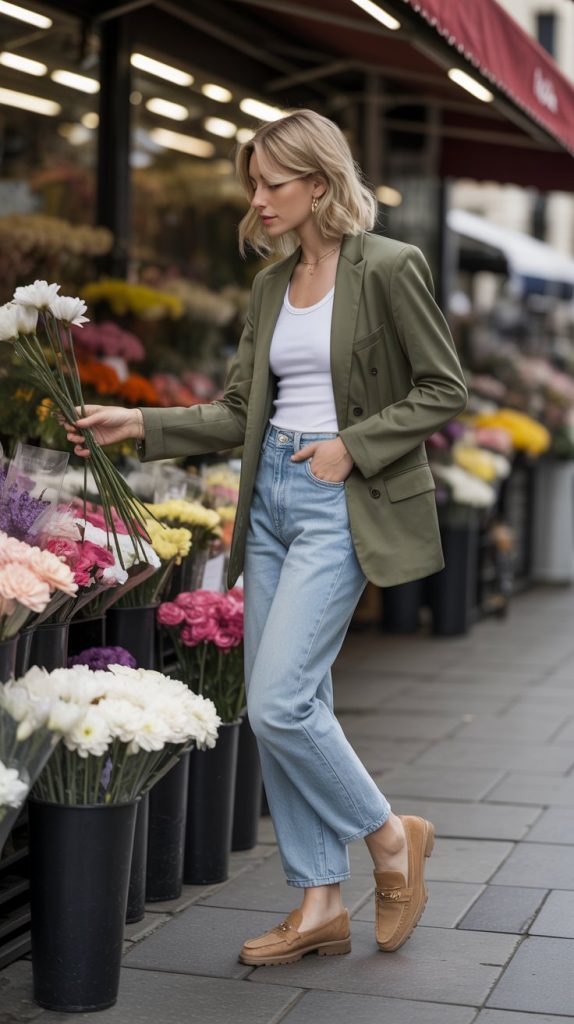 Style Notes: Stone-wash denim sits in a cool, muted register that pairs surprisingly well with olive — a combination that feels very considered and slightly unexpected without breaking any quiet luxury rules. The white ribbed top underneath keeps the base clean and the tan suede loafer warms the palette back up at the foot. I’d style this for a creative office environment, a relaxed lunch date, or a weekend afternoon that still needs to look intentional.