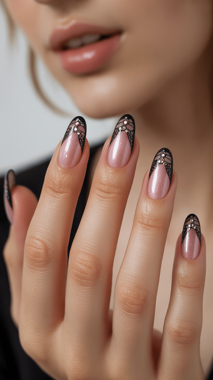 Black lace decorations represent the pinnacle of elegance. Just think: a sexy little black dress with black lace nails will surely charm everyone present. Black lace decorations are ideal for night events where the goal is to attract attention.
