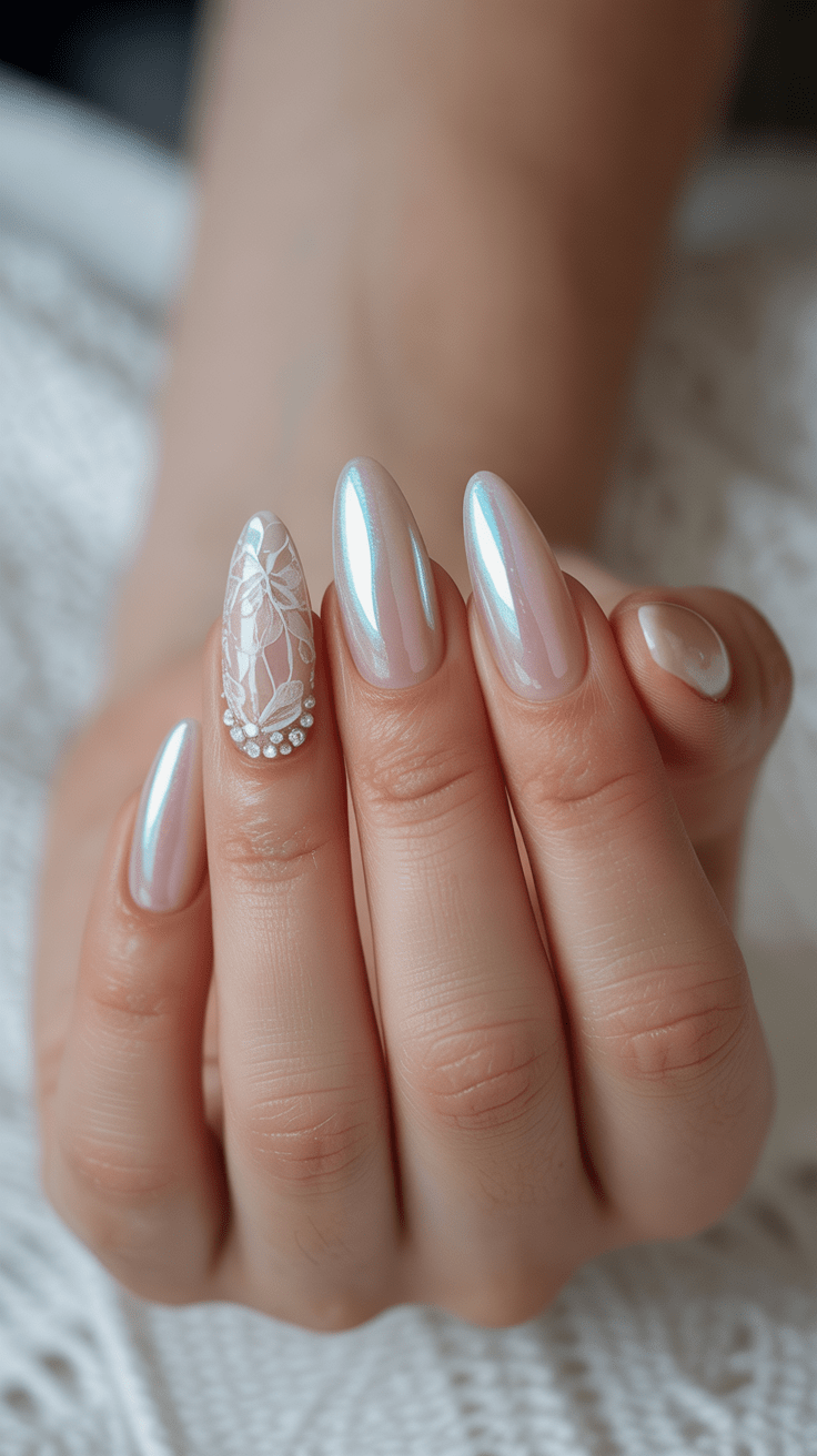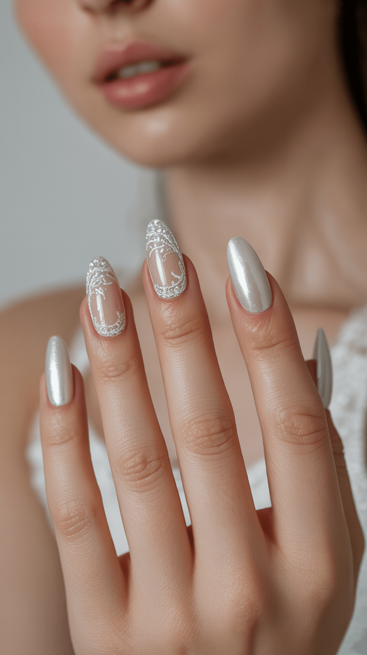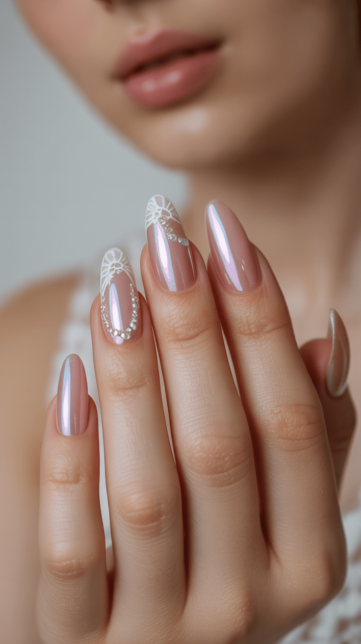 White lace decoration is the epitome of purity and elegance. Who hasn’t dreamed of showing off beautiful white lace-adorned nails on their wedding day? When I was preparing for my own wedding, I was looking for exactly this look. White lace goes wonderfully with snow-white wedding dresses and creates a magical atmosphere.