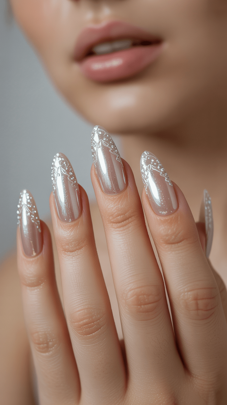 Silver lace goes especially well with light, pastel-colored dresses and can be a great choice if you want to add a little modern twist to your look. Imagine wearing silver lace nails with your favorite light blue blouse – the effect is simply stunning!