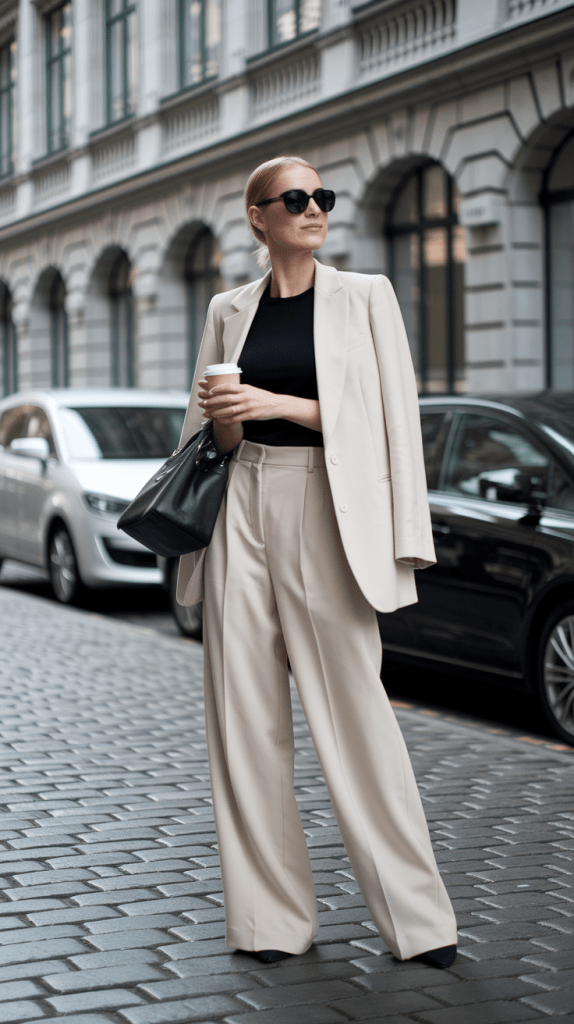 The Modern Minimalist: A beige turtleneck tucked into high-waisted wool trousers, finished with a long tailored coat and pointed-toe boots. Perfect for meetings, coffee dates, or simply feeling unstoppable.