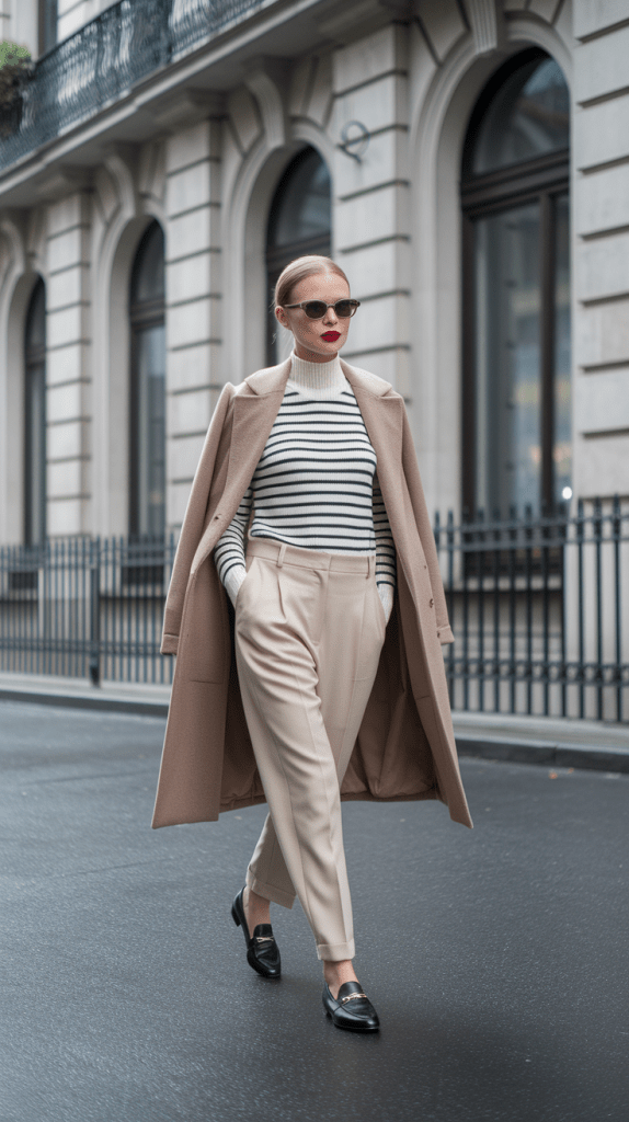 The Everyday Icon: Wool-blend trench coat + turtleneck + wide-leg trousers + loafers. Add a soft leather bag and minimal gold hoops for a touch of polish.