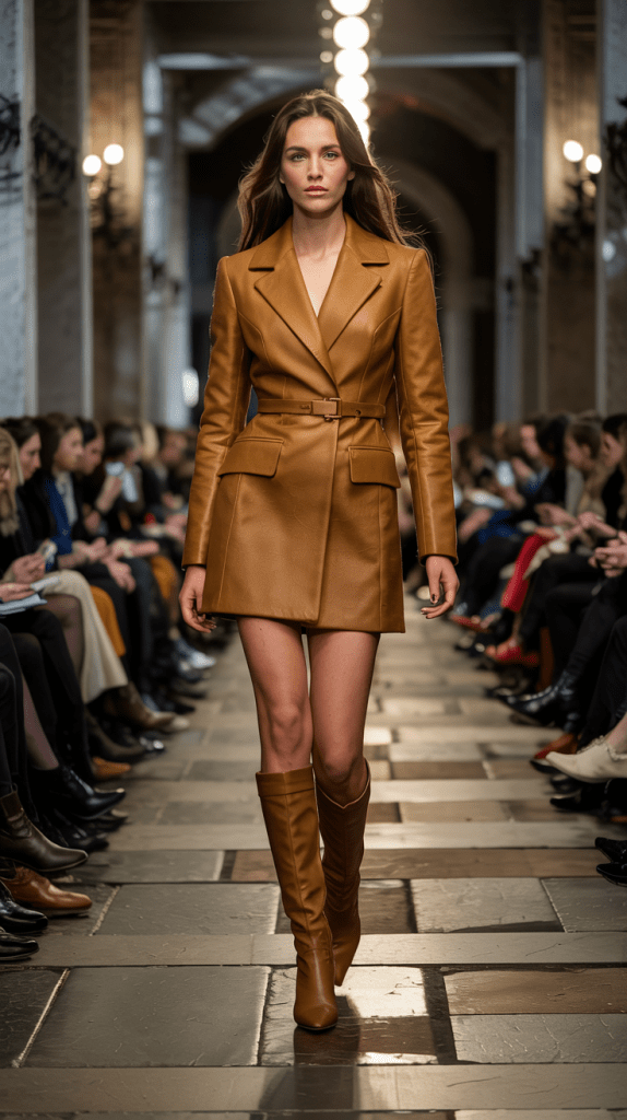 Short hemlines are back with a bold vengeance. Mini dresses in Fall/Winter 2025 are no longer reserved for summer evenings—they’re styled for the cold. Think structured wool minis, leather A-line cuts, and boucle fabrics paired with opaque tights and knee-high boots.