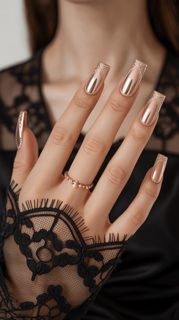 Think ballet slipper meets shimmer. Pink glazed donut nails bring softness and romance into the chrome trend. Whether you choose a baby pink base or a muted rose tone, the result is dreamy and delicate.