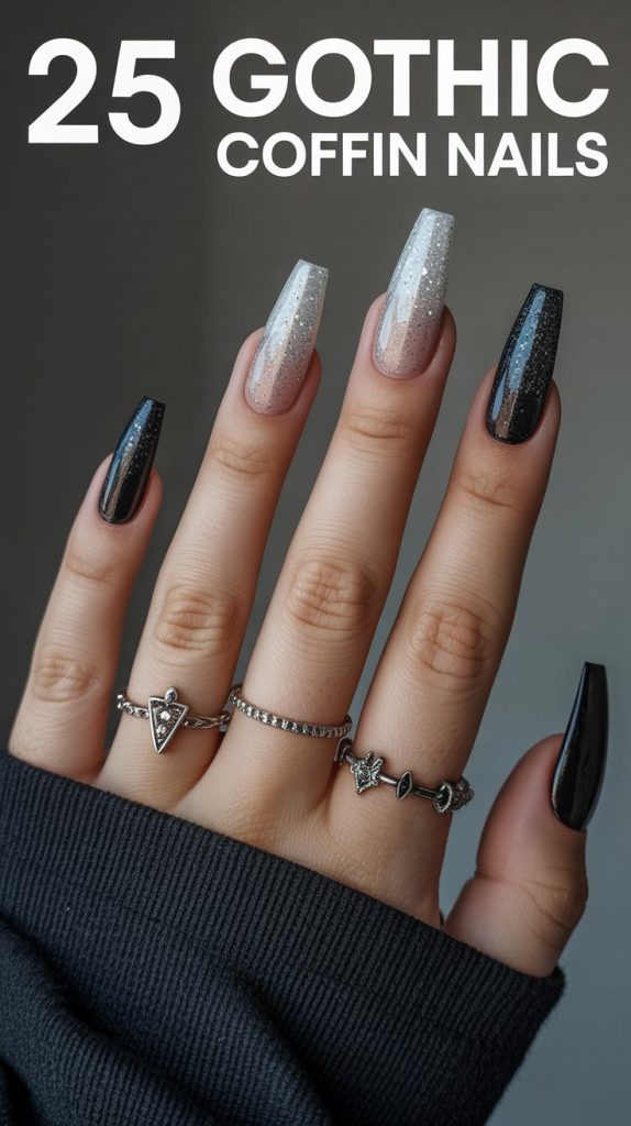 lean into contrast and sharpness. Black, silver, icy greys, and glass-like finishes feel cold and dramatic. Coffin nails amplify this effect by adding structure and length, making winter gothic nails feel crisp and deliberate.