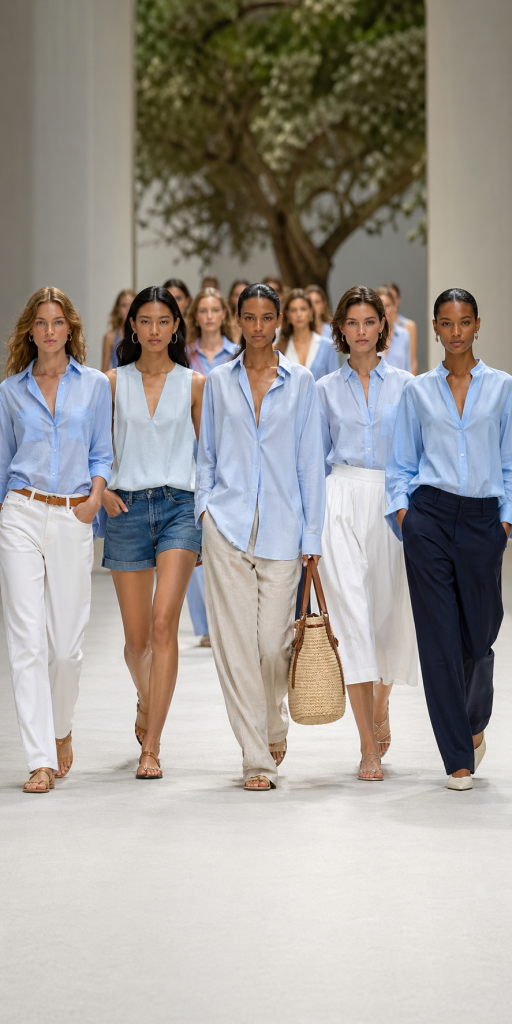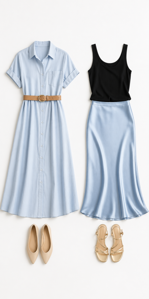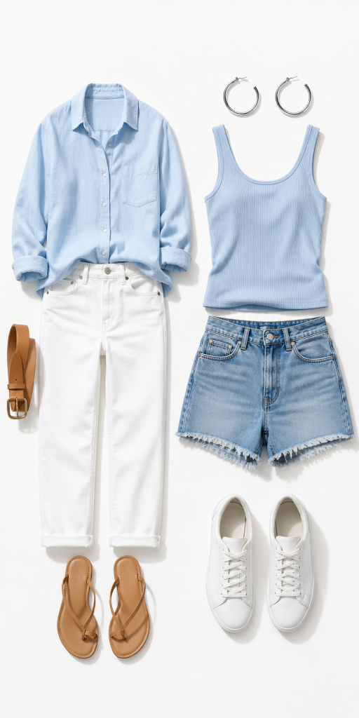 A crisp icy blue button-down shirt is especially useful. You can wear it tucked into white jeans, left open over a tank top, tied loosely with linen shorts, or styled with tailored trousers for work. It gives a polished feeling without looking too formal.