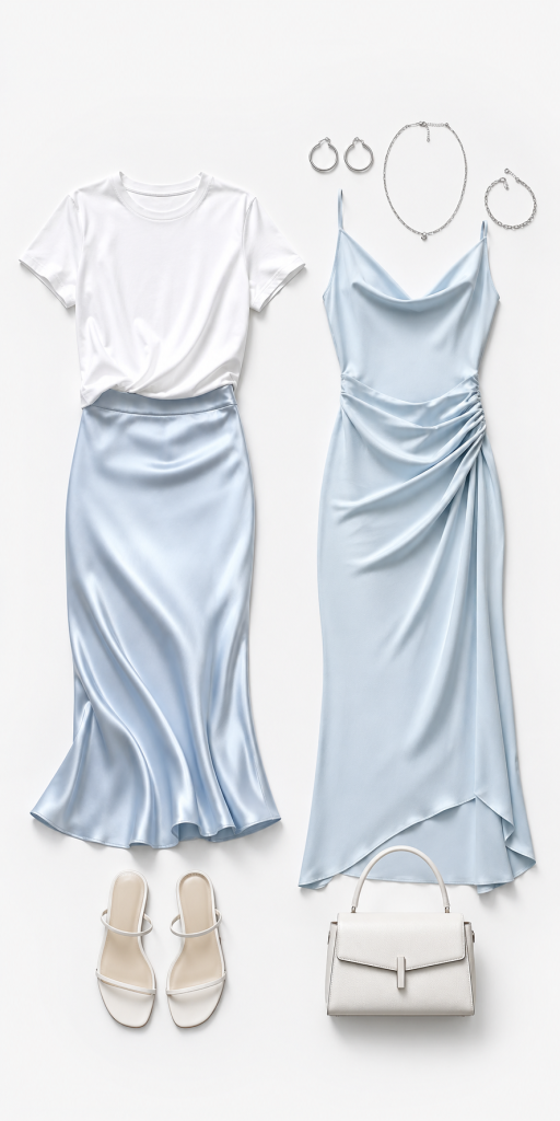 The fabric matters. Crisp cotton, linen, satin, silk-effect materials, and structured denim usually make icy blue look more elevated. Thin, clingy, overly shiny, or cheap-looking fabrics can make the color feel less polished.