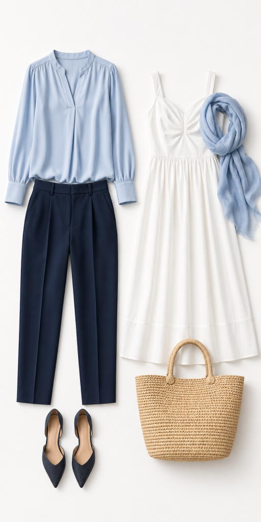 The easiest way to make icy blue wearable is to anchor it with white. Continue with The Icy Blue and White Capsule Wardrobe for Fresh Summer Outfits if you want a full wardrobe plan based on this fresh summer combination.