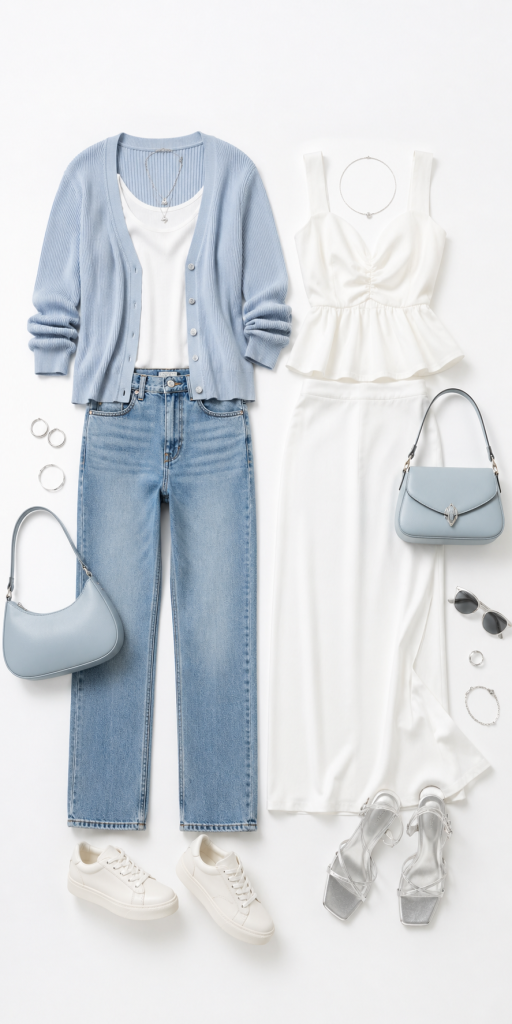 This is also the perfect place to use silver jewelry. Silver hoops, a slim chain necklace, or metallic sandals can make the icy blue and white combination feel sharper and more current.