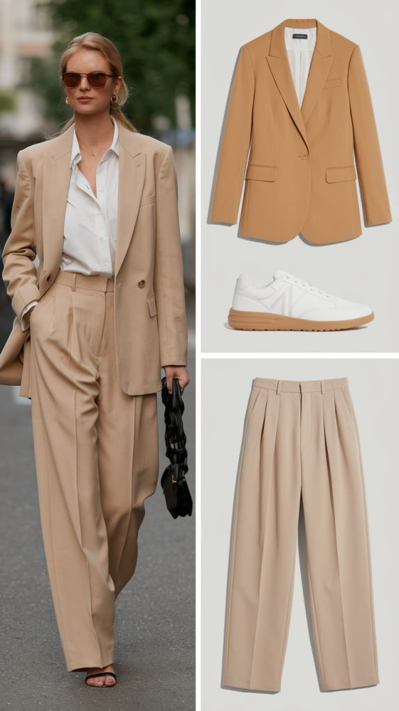 A beige blazer, tailored trousers, and pointed-toe flats create an outfit that feels seasonal but professional. Dresses in midi length with subtle details also work beautifully for spring office wear.