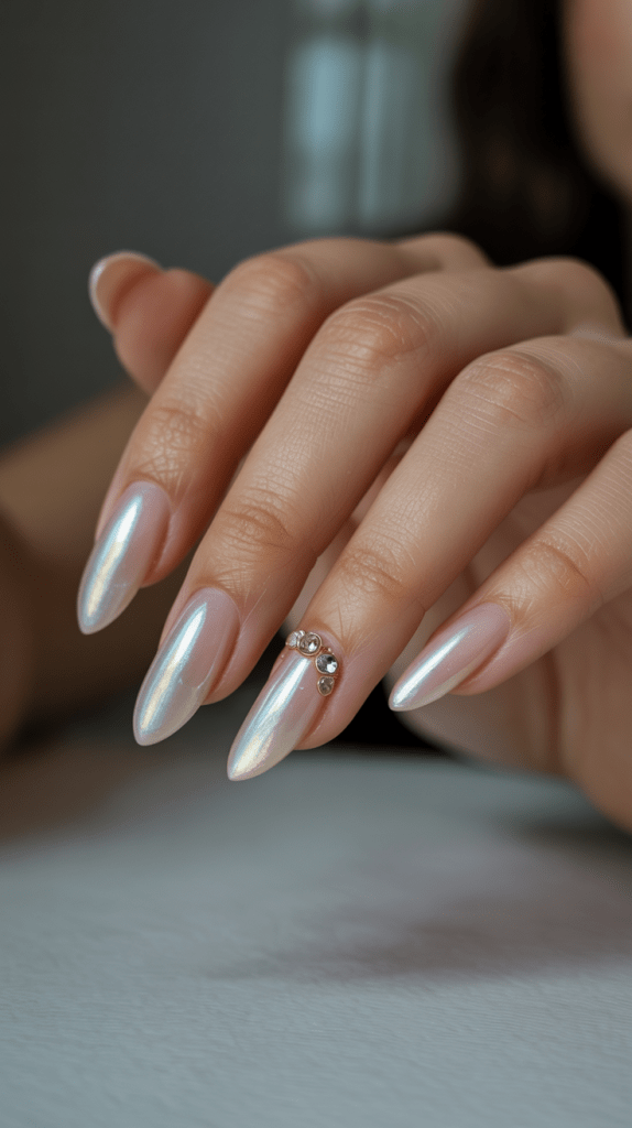 Minimal decoration is very trendy these days, such as a thin white line near the edge of the nail or a small beaded decoration.