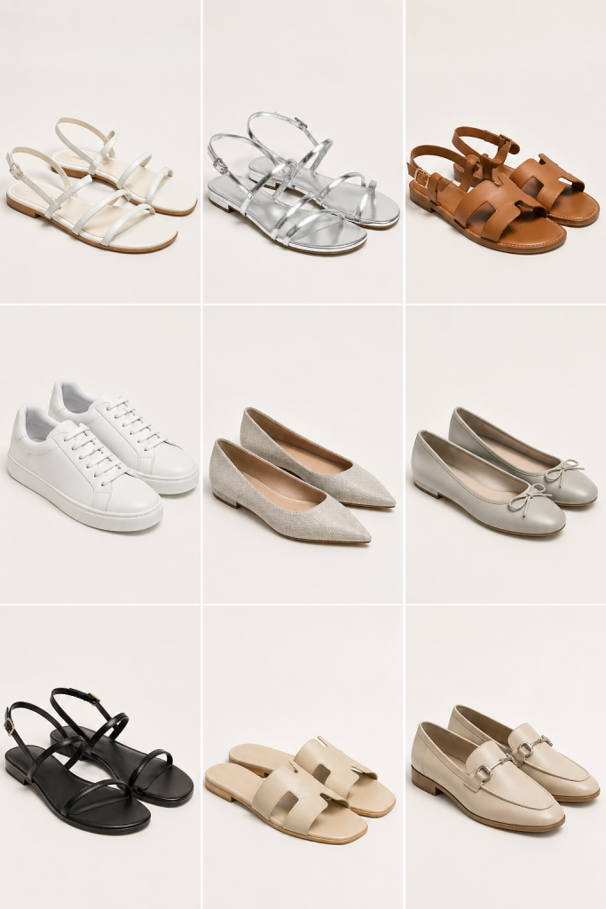 White sandals, silver sandals, tan leather sandals, minimal sneakers, pointed flats, loafers, and simple black sandals all work well.