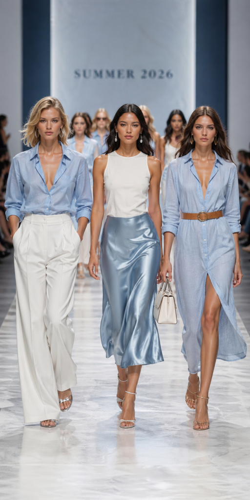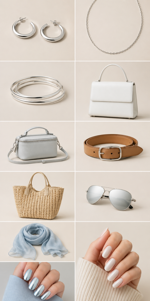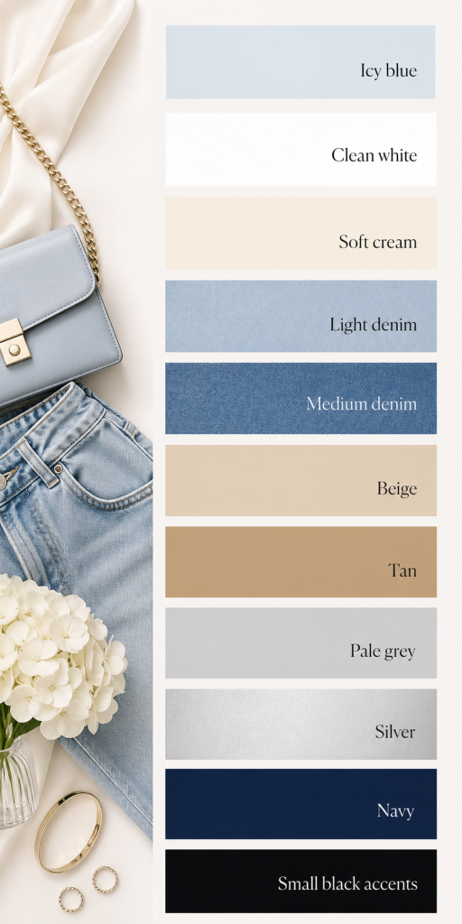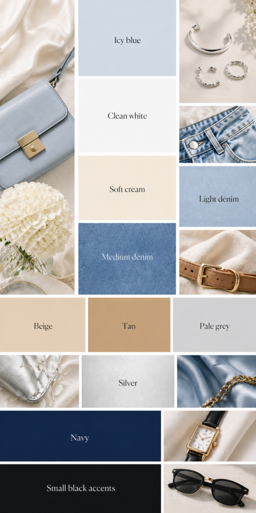 The strongest combinations are simple: icy blue with white, denim, linen, beige, tan, silver, navy, or black accents. These pieces keep the color clean, wearable, and grown-up.