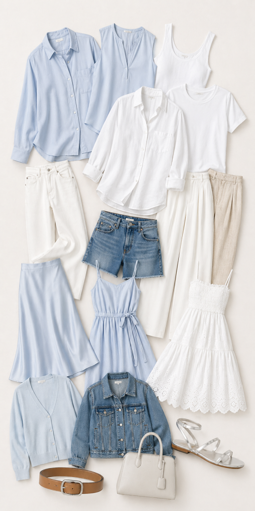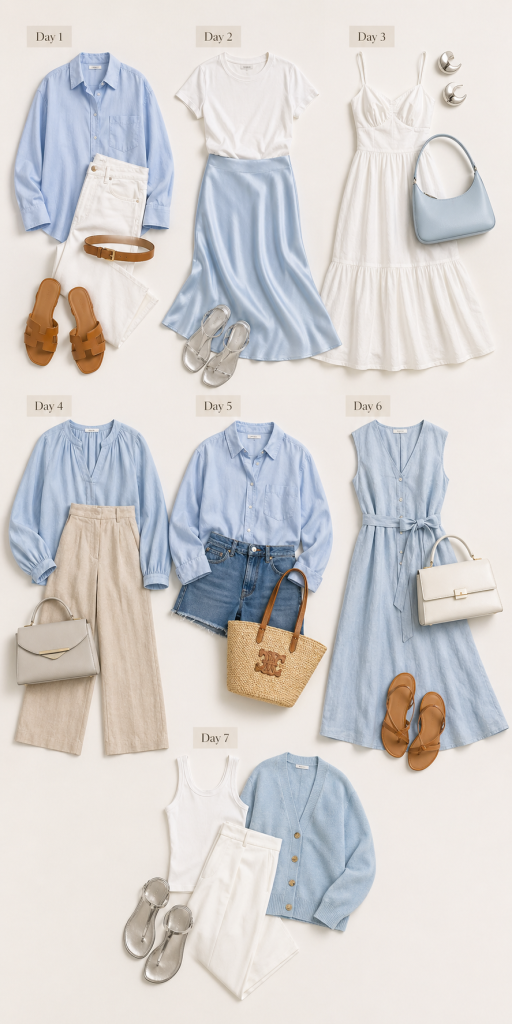 They stop icy blue from looking too cold and make the capsule feel more natural. This is one of the best combinations for vacation outfits and relaxed summer days.