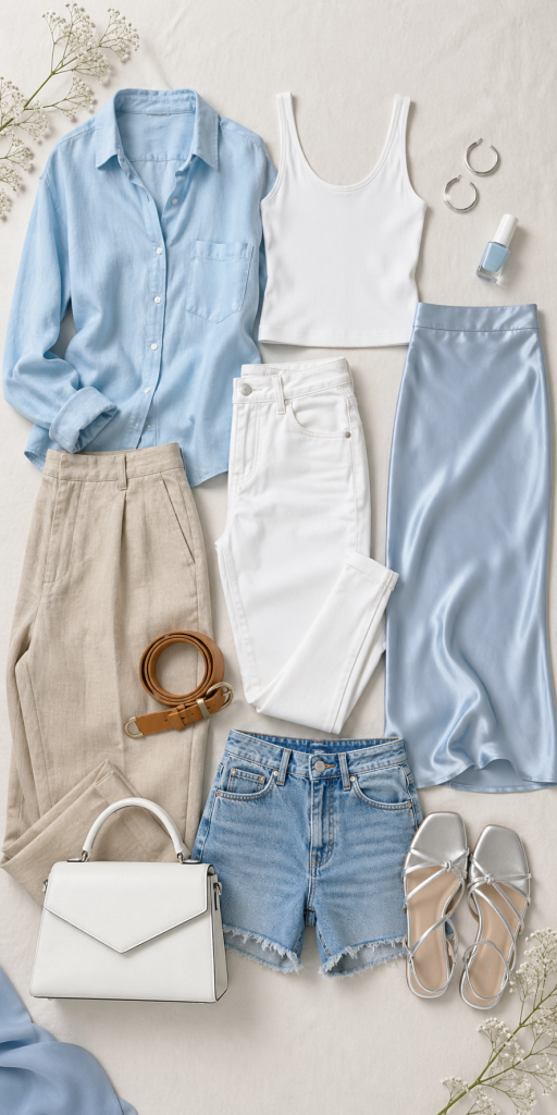 An icy blue summer capsule wardrobe is a curated set of pale blue, white, denim, linen, silver, and neutral pieces that create fresh, polished summer outfits. The best icy blue capsule wardrobe includes versatile basics such as an icy blue button-down shirt, white jeans, linen trousers, a satin skirt, denim shorts, silver sandals, a structured bag, and minimal accessories. To keep icy blue looking elegant instead of too sweet, style it with clean silhouettes, crisp white, structured denim, silver jewelry, tan or beige accents, and simple summer shoes.