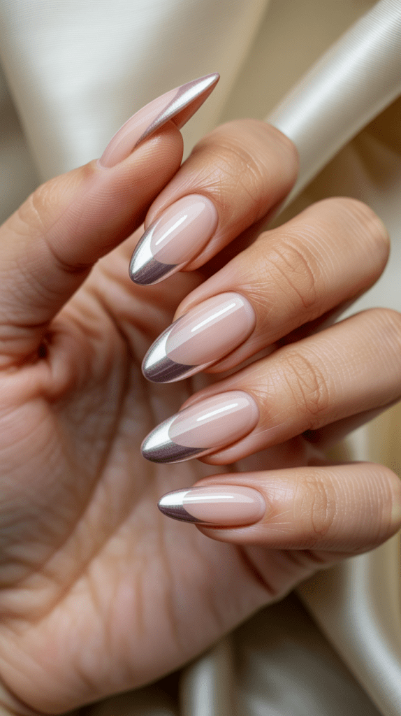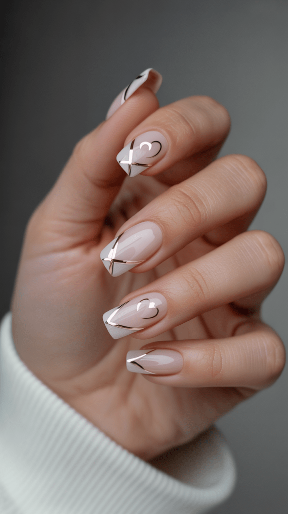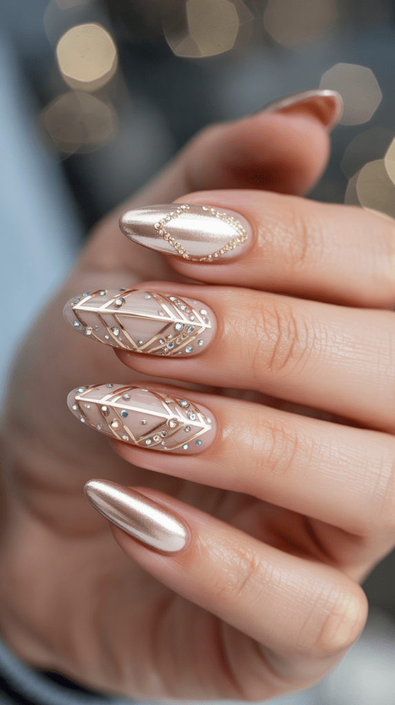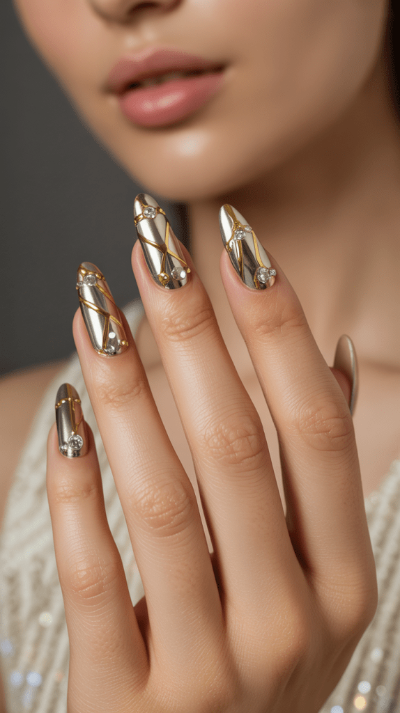 Gold and silver nail stickers, tiny dots or thin stripes decorate the nails in a restrained yet festive way. For example, a metallic gold line painted on a simple nude base creates an extremely elegant and modern effect.