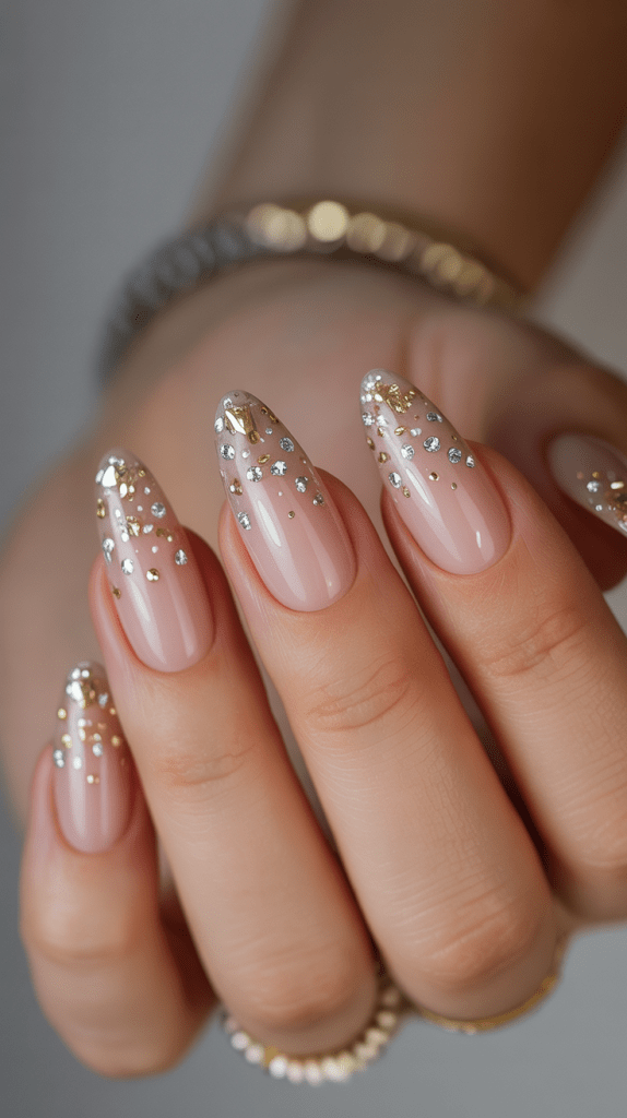 In the sparkling ombre style, the combination of silver and gold shades can be particularly spectacular. Starting from the nail bed, the gold and silver glitter can gradually blend, creating a magical transition.
